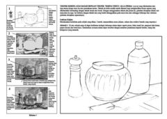 Aktiviti 5 : Di atas sebuah meja di dapur kelihatan terdapat beberapa alatan dapur seperti pisau, bikar tanah liat, pengisar lada hitam, papan hirisan dan botol kaca. Gambarkan susunan alatan dapur tersebut dengan memberi penekanan kepada bentuk, ruang dan komposisi yang menarik.